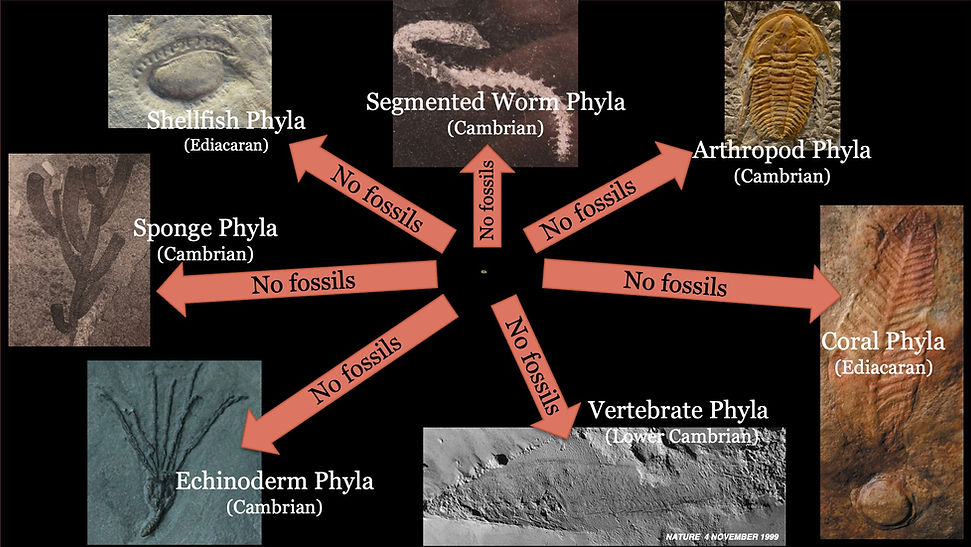 Question: Why does EVERY animal phyla group appear in the fossil record without evolutionary ancestors? If evolution occurred (if a single cell microscopic bacterium-like organism slowly changed into the seven major animal groups), why are there no fossils of the intermediate animals between these two groups? Why are there only fossils at the base of evolution diagrams (bacteria) and fossils at the tips of the diagrams (corals, sponges, shellfish, worms, arthropods, echinoderms, and fish), and no ancestors between the two?